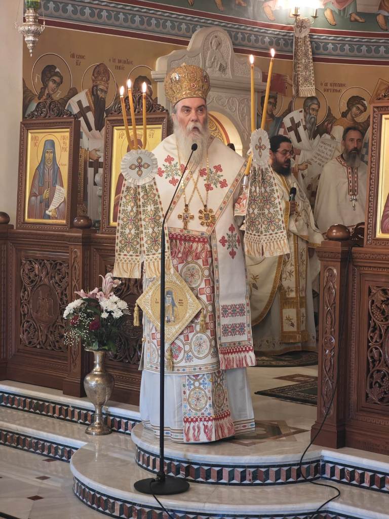 Ο Επίσκοπος μας σημείωσε μεταξύ άλλων: «Δοξολογία και αίνο αναπέμπουμε στον Άγιο Τριαδικό Θεό ο Οποίος πλουσιοπάροχα μας δωρίζει τις ευλογίες Του. Ευχαριστιακά μνημονεύουμε τον Σεβ. Μητροπολίτη Γορτύνης και Αρκαδίας κ. Μακάριο, τη ευλογία και αδεία του οποίου, ο Εφημέριος του τόπου καταγωγής του Οσίου Ευμενίου, Αιδ. π. Δημήτριος Κρουσταλάκης, κόμισε προς ευλογία και προσκύνηση ιερό Επιτραχήλιο του Οσίου Ευμενίου του νέου, το οποίο και φυλάσσεται στην Ενορία Εθιάς. Σήμερα όμως αγάλλεται και χαίρεται και ο Ουρανός καθώς εδώ στο Συρικάρι, στο σπίτι του Οσίου Νικηφόρου του λεπρού, συναντώνται οι μεγάλοι μας Όσιοι:  Άνθιμος ο εν Χίω, ιερό λείψανο του οποίου χαρίστηκε στο ιερό προσκύνημα από τον Σεβ. Μητροπολίτη Χίου, Ψαρών και Οινουσσών κ. Μάρκο, Νικηφόρος ο λεπρός και Όσιος Ευμένιος ο νέος, δια του ιερού επιτραχηλίου του, το οποίο οι προσευχές του Οσίου και οι Θείες Λειτουργίες έχουν καθαγιάσει. Πνευματικός πατέρας ο Όσιος Άνθιμος, πνευματικός υιός ο Όσιος Νικηφόρος και πνευματικός εγγονός ο Όσιος Ευμένιος, συναντώνται σήμερα εδώ, στο Συρικάρι, συν-αγάλλονται και συν-ευφραίνονται μαζί μας.