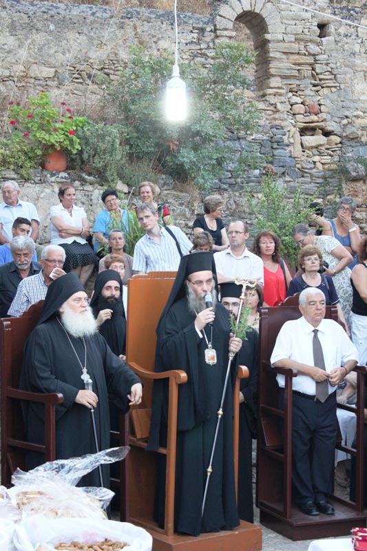 Ο Σεβασμιώτατος Μητροπολίτης μας στην σύντομη ομιλία του αναφέρθηκε στα μηνύματα που αναδύονται από τον ιερό και μαρτυρικό αυτό τόπο, καθώς όπως είπε: «το μεγάλο ζητούμενο της εποχής μας είναι το πνεύμα αφύπνισης, εγρήγορσης και αντίστασης ενάντια στις σύγχρονες μορφές δουλείας και κατάκτησης», κάνοντας αναφορά στην επικαιρότητα όπως η απαγόρευση κρούσης των καμπανών, η κατάργηση της αργίας της Κυριακής, η καύση των νεκρών μόνον με την συγκατάθεση των συγγενών ακόμα και χωρίς την σύμφωνη γνώμη του θανόντος, κ.α. Ευχαρίστησε τον Καθηγούμενο της Ιεράς Μεγίστης Μονής Βατοπαιδίου κ. Εφραίμ για την ουσιαστική στήριξη της Μονής Βατοπαιδίου στο προνοιακό, φιλανθρωπικό και κοινωνικό έργο της Μητροπόλεως και του έδωσε τον λόγο. Ο Γέροντας Εφραίμ ομίλησε για το πρόσωπο της Παναγίας, η Οποία όπως είπε «είναι το καταφύγιο και το απάνεμο λιμάνι μας», κάλεσε δε όλους να εμπιστευτούμε ακόμα περισσότερο το Σεπτό Της Πρόσωπο και σε Εκείνη να εναποθέτομε τον πόνο, τις αγωνίες μας, τις θλίψεις και τα αιτήματα μας.