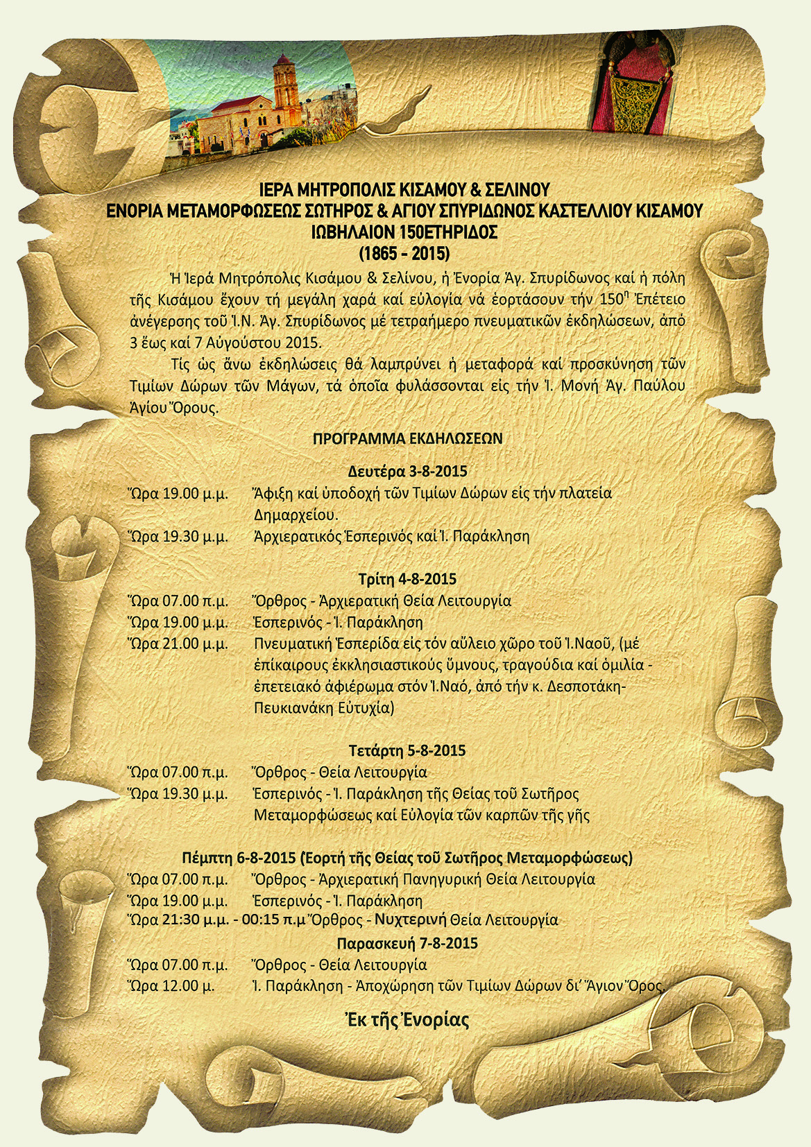 Η Ιερά Μητρόπολις μας, η Ενορία Αγίου Σπυρίδωνος και η πόλις της Κισάμου έχουν την μεγάλη ευλογία και χαρά να εορτάζουν την 150η επέτειο λειτουργίας του ιστορικού Ι.Ναού Αγίου Σπυρίδωνος, με την έλευση των Τιμίων Δώρων των Μάγων, εκ της Ι.Μονής Αγ.Παύλου Αγίου Όρους, και συμφώνως προς το ακολουθούν Πρόγραμμα. Καλείται ο λαός του Θεού όπως μετέχει εις το πνευματικό αυτό πανηγύρι της χαράς.
