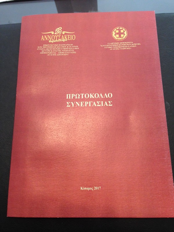 Υπεγράφη Πρωτόκολλο Συνεργασίας μεταξύ του Γενικού Νοσοκομείου Χανίων «Ο Άγιος Γεώργιος» και του Αννουσάκειου Θεραπευτηρίου Κισάμου, Κέντρου Κλειστής Νοσηλείας Αποθεραπείας – Αποκατάστασης «Ο Άγιος Σπυρίδων», Ίδρυμα της Ιεράς Μητροπόλεως μας, κατόπιν προγραμματισμένης συνάντησης στους χώρους του Αννουσάκειου Ιδρύματος.