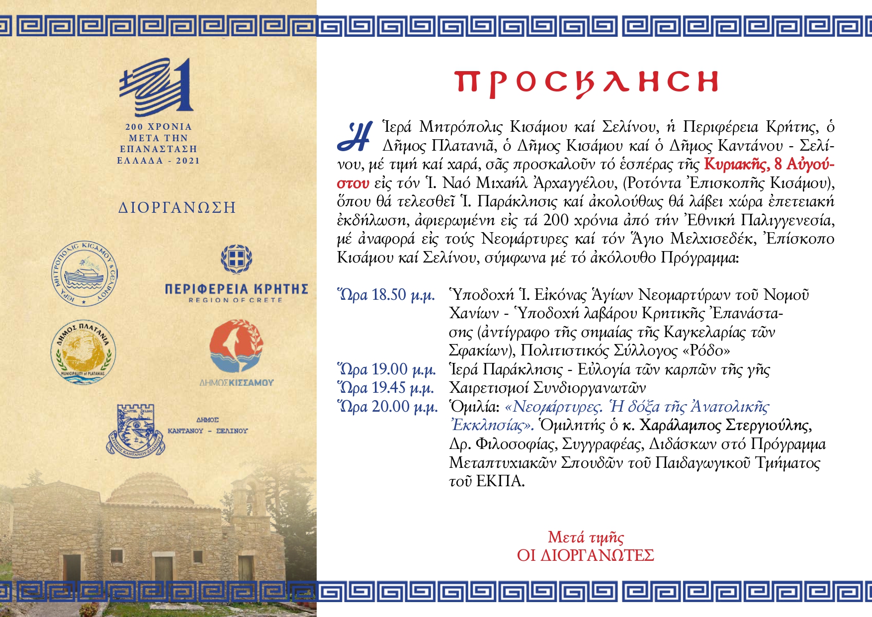 Η Ι. Μητρόπολη Κισάμου και Σελίνου σε συνεργασία με την Περιφέρεια Κρήτης και τους Δήμους: Πλατανιά, Κισάμου και Καντάνου – Σελίνου, το εσπέρας της Κυριακής 8 Αυγούστου στον Ι. Ναό Μιχαήλ Αρχαγγέλου, Ροτόντα Επισκοπής Κισάμου, συνδιοργανώνουν επετειακή εκδήλωση αφιερωμένη στα 200 χρόνια από την Εθνική Παλιγγενεσία, με αναφορά στους Νεομάρτυρες και τον Άγιο Μελχισεδέκ, Επίσκοπο Κισάμου και Σελίνου, σύμφωνα με το ακόλουθο Πρόγραμμα:
