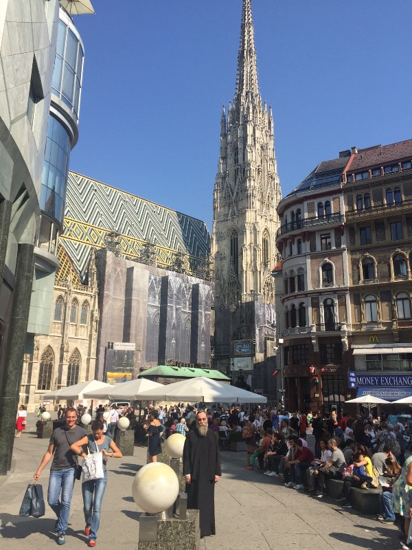 Προσκεκλημένος του Σεβ. Μητροπολίτου Αυστρίας κ. Αρσενίου ο Επίσκοπος μας επισκέφθηκε την Βιέννη, όπου και η έδρα της Ι. Μητροπόλεως Αυστρίας. Στην ολιγοήμερη εκεί παραμονή του είχε την ευκαιρία να γνωρίσει εκ του σύνεγγυς το ιδιαίτερα σπουδαίο και σημαντικό Ποιμαντικό και Ιεραποστολικό έργο που επιτελεί ο Σεβ. Μητροπολίτης Αυστρίας κ. Αρσένιος, ο οποίος ίδρυσε ανδρώα κοινοβιακή Ιερά Μονή σε προάστιο της Βιέννης εγκαθιστώντας μοναχική Αδελφότητα, νέες Ενορίες στην Βιέννη και όλη την Αυστρία, χειροτονεί νέους αξιόλογους Κληρικούς, επανδρώνει την εξαρχία της Ουγγαρίας και φροντίζει δια τον εκεί Ελληνισμό, προσφέρει ευκαιρίες δωρεάν εκμάθησης της Γερμανικής γλώσσας σε πλήθος Ελλήνων που τα τελευταία χρόνια, λόγω της κρίσης, κατακλύζουν την Αυστρία, επιτελώντας σπουδαίο και αξιοθαύμαστο Ιεραποστολικό έργο. Κατά την σύντομη παραμονή του στην Αυστρία ο Επίσκοπος μας είχε την ευκαιρία να επισκεφθεί, μετά του Σεβασμιωτάτου Μητροπολίτου Αυστρίας κ. Αρσενίου, και την Ουγγαρία της οποίας ο Σεβ. Αυστρίας είναι έξαρχος και να γνωρίζει από κοντά την εκεί ζωντανή Ελληνική Παροικία και το έργο που επιτελεί ο Σεβασμιώτατος κ. Αρσένιος.