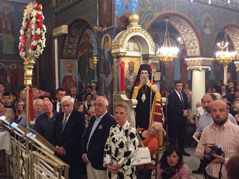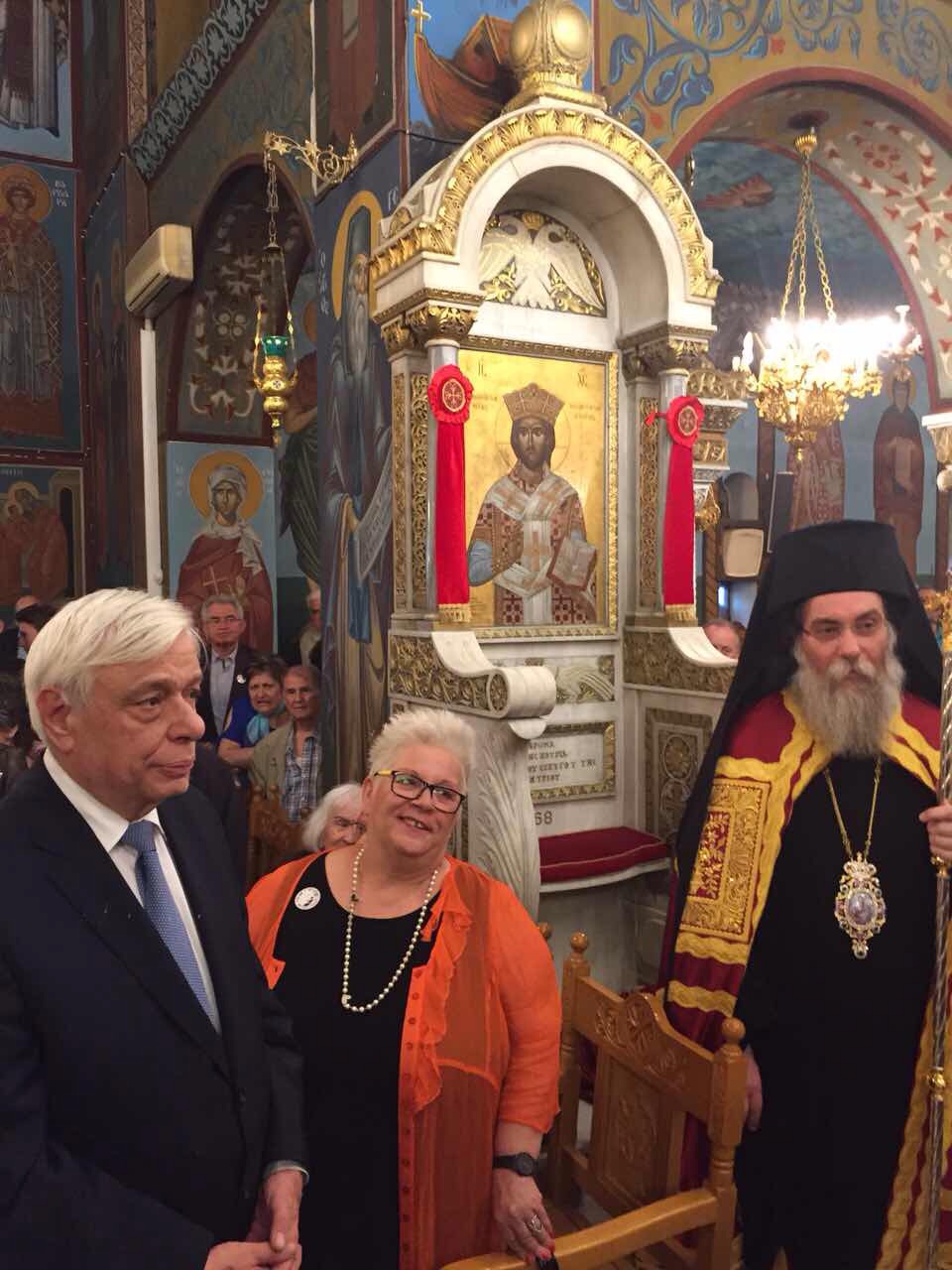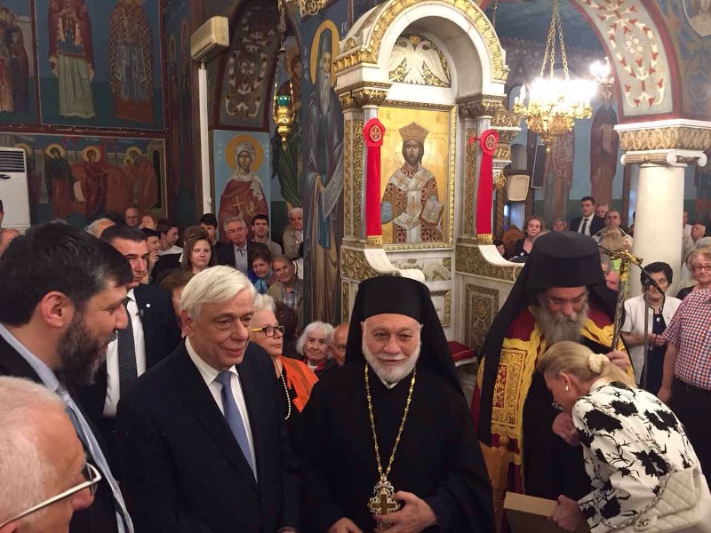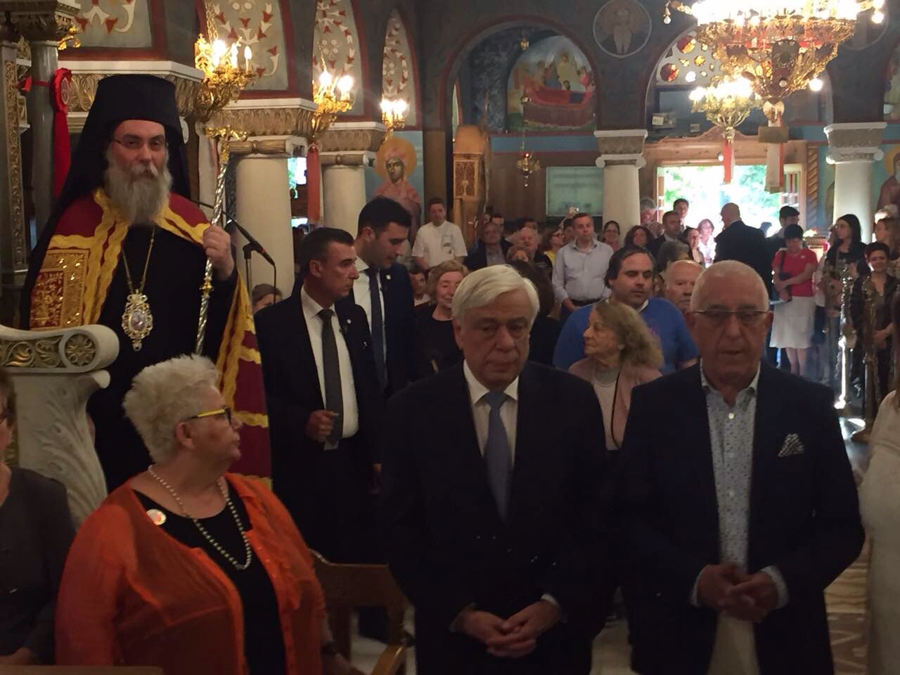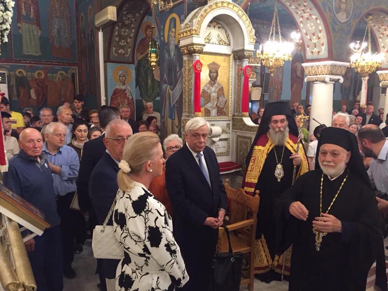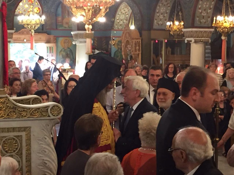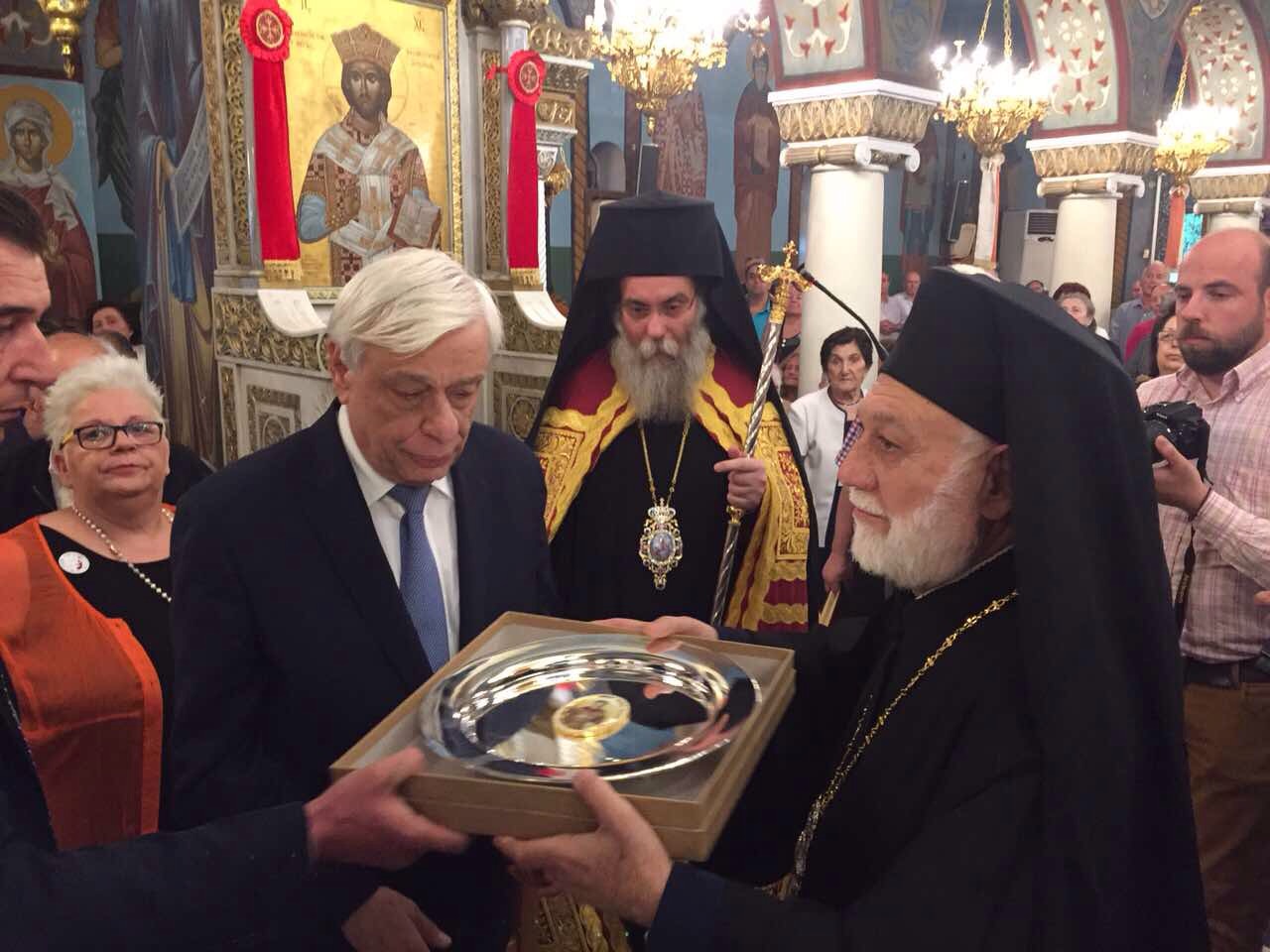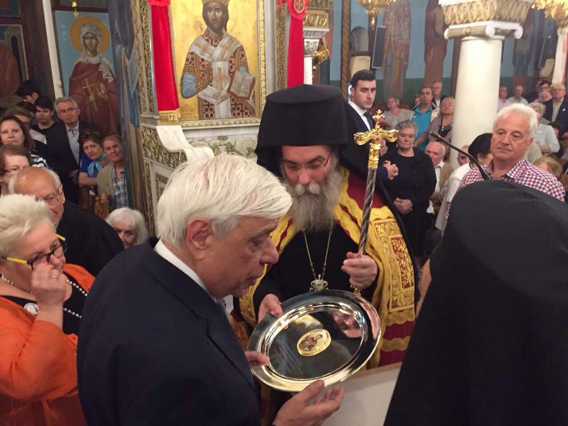 Του Εσπερινού μετείχε και ο Εξοχώτατος Πρόεδρος της Ελληνικής Δημοκρατίας κ. Προκόπης Παυλόπουλος, προς τον οποίο ο Ιερατικώς Προϊστάμενος π. Κλήμης καλωσορίζοντας τον προσέφερε αργυρούν δίσκο με σμάλτινη απεικόνιση του Αγίου Προκοπίου. Ο Σεβ. Μητροπολίτης μας κ. Αμφιλόχιος ευχήθηκε τα εικότα εις τον εξ. Πρόεδρο της Ελληνικής Δημοκρατίας, ο οποίος εξέφρασε την χαρά του δια την συνάντηση αυτή καθώς, όπως είπε: «έχει αγαθές αναμνήσεις από την Μεγαλόνησο Κρήτη».