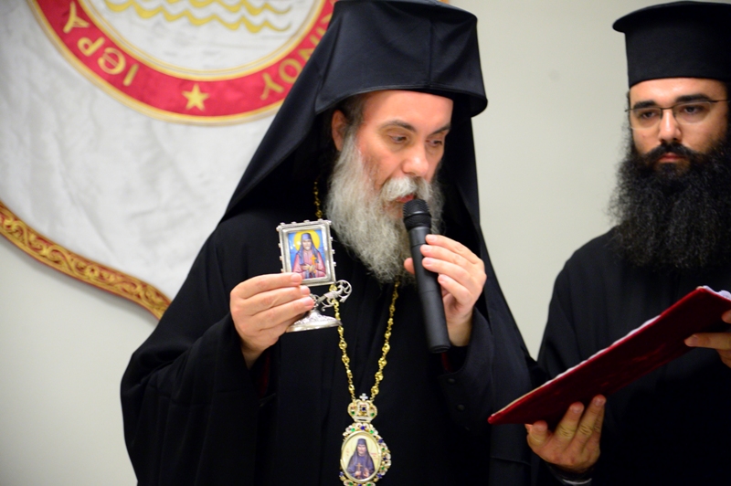 Όμιλος νέων με παραδοσιακές στολές εκ των Παραδοσιακών Συλλόγων: «Όμιλος Βρακοφόρων Κισάμου», Χάρη & Γιάννη Κουμή, «Η Κίσσαμος», Άλκηστης Ξηρουχάκη και «Ο Γηγενής», Πολυχρονάκης Γεωργίας και Ρουπάκη Νίκου, υποδέχθηκαν τους προσκεκλημένους. Ο Σεβ. Μητροπολίτης μας κ. Αμφιλόχιος, ο οποίος και υποδέχθηκε τον Παναγιώτατο ως και όλους τους προσκεκλημένους, εκφράζοντας την ευχαριστία και ευγνωμοσύνη της Μητροπόλεως μας δια την μεγάλη αυτή τιμή και χαρά, σημείωσε σε σύντομο χαιρετισμό του: «Ὡς ὄμβρος οὐράνιος καί δρόσος Ἀερμών καταρδεύει τό γεώργιον τῆς ταπεινῆς Ἱερᾶς Μητροπόλεώς μας ἡ χαροποιός, θεοδώρητος καί εὐλογητική παρουσία πάντων ἡμῶν κατά τό παρατιθέμενον ἀπέριτον αυτό δεῖπνον εἰς τούς φιλοξένους χώρους τοῦ Τσατσαρωνακείου πολιτιστικοῦ πολυκέντρου, τό ὁποῖον ἀποτελεῖ -ὡς γνωστόν- δῶρον τῆς ἀγάπης καί τῆς πολυμεροῦς ἀρωγῆς τῆς οἰκογενείας Νικολάου και Μαρίας Τσατσαρωνάκη πρός τήν Ιεράν Μητρόπολίν μας».